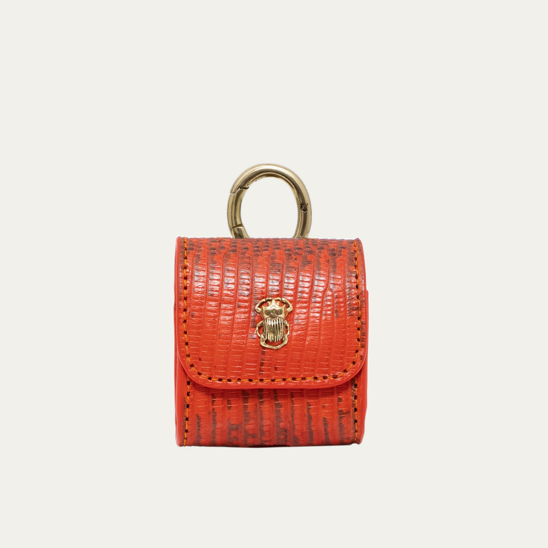 Our first all-lizard Jamie AirPod case features a gold beetle on the front. Its carabiner hook lets you attach it to your trouser loops, bag or cell phone case, like our Double Marcus.