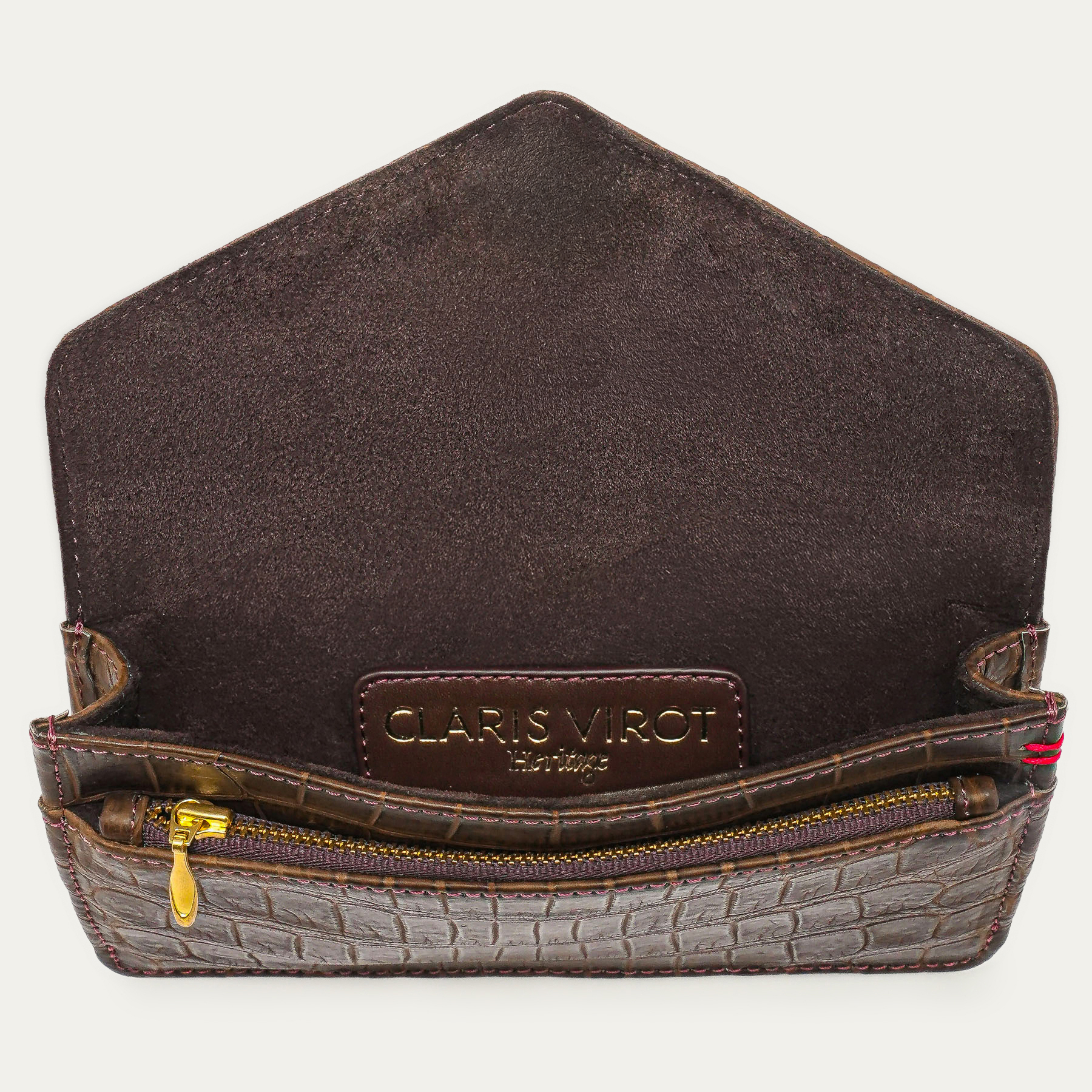 Inspired by the iconic Alex design, this elongated crocodile-embossed leather wallet stands out for its clean and elegant lines. It closes with a flap adorned with the signature beetle and features a spacious main compartment along with a zipped coin pocket. A practical yet refined format for everyday use.