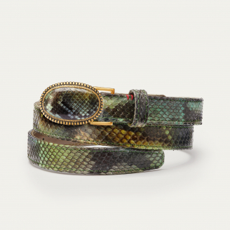 Nos ceinturons en python sont tous doublés de cuir. Ils sont ornés de différentes métalleries en laiton argentées ou dorées. Au fil des collections, les animaux totem de la marque varient. On peut notamment retrouver le serpent, le scarabée, la tortue et la grenouille.