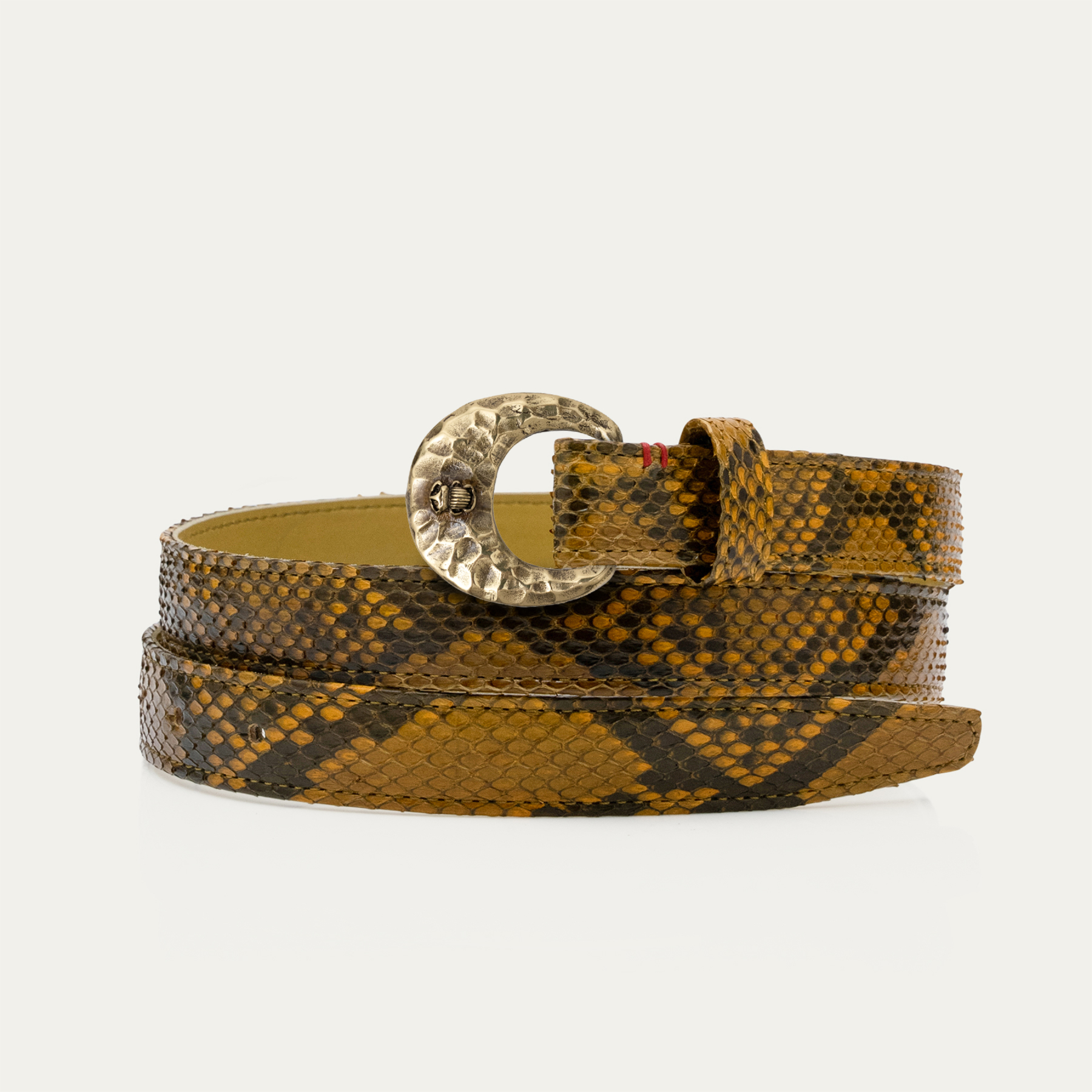 Nos ceinturons en python sont tous doublés de cuir. Ils sont ornés de différentes métalleries en laiton argentées ou dorées. Au fil des collections, les animaux totem de la marque varient. On peut notamment retrouver le serpent, le scarabée, la tortue et la grenouille.