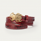 Nos ceinturons en python sont tous doublés de cuir. Ils sont ornés de différentes métalleries en laiton argentées ou dorées. Au fil des collections, les animaux totem de la marque varient. On peut notamment retrouver le serpent, le scarabée, la tortue et la grenouille.