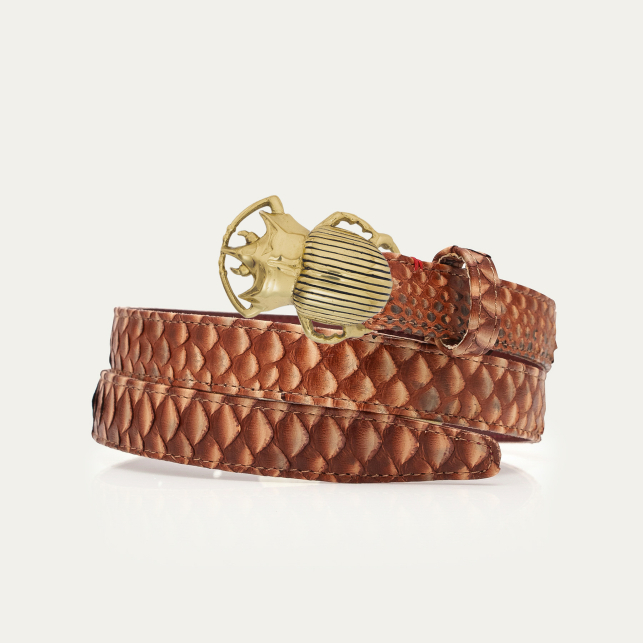 Nos ceinturons en python sont tous doublés de cuir. Ils sont ornés de différentes métalleries en laiton argentées ou dorées. Au fil des collections, les animaux totem de la marque varient. On peut notamment retrouver le serpent, le scarabée, la tortue et la grenouille.