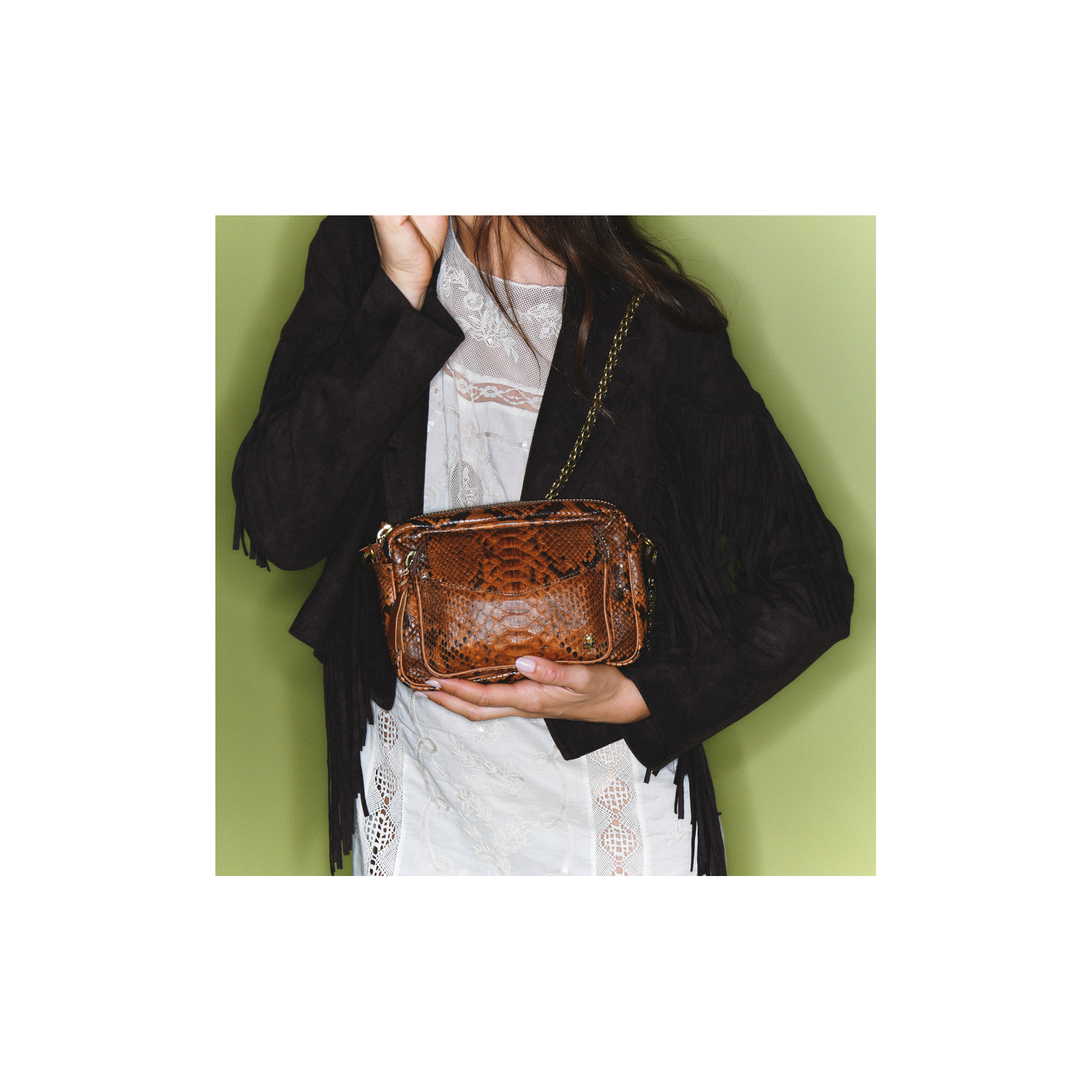 Ce sac porté croisé ou épaule est organisé en un compartiment avec une poche à l'avant. Notre Charly en python est muni d'une chaîne artisanale et de nombreux espaces de rangement qui vous faciliteront la vie. Grâce à ses couleurs uniques, sa forme intemporelle, et sa matière souple, notre Charly trouvera immédiatement sa place dans votre dressing !