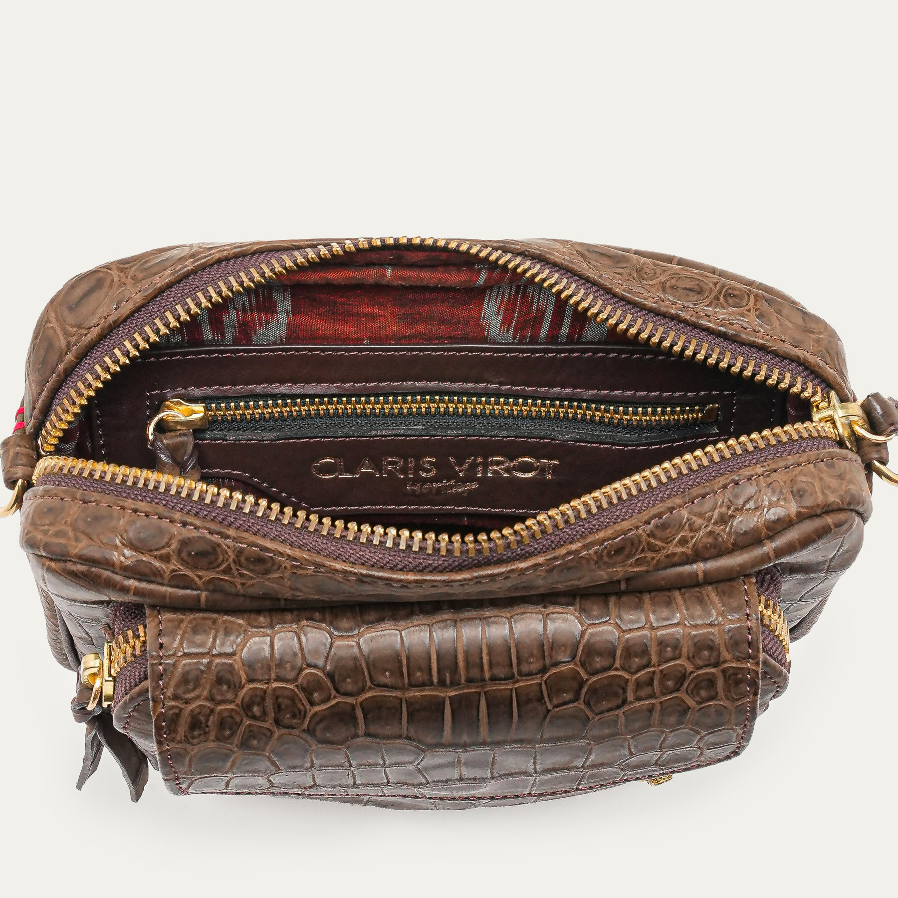 Ce sac en cuir embossé croco se porte croisé ou à l’épaule grâce à sa chaîne artisanale. Il dispose d’un compartiment principal avec une poche frontale et est orné du scarabée bijou emblématique. Entièrement doublé en coton, il combine élégance et fonctionnalité au quotidien.