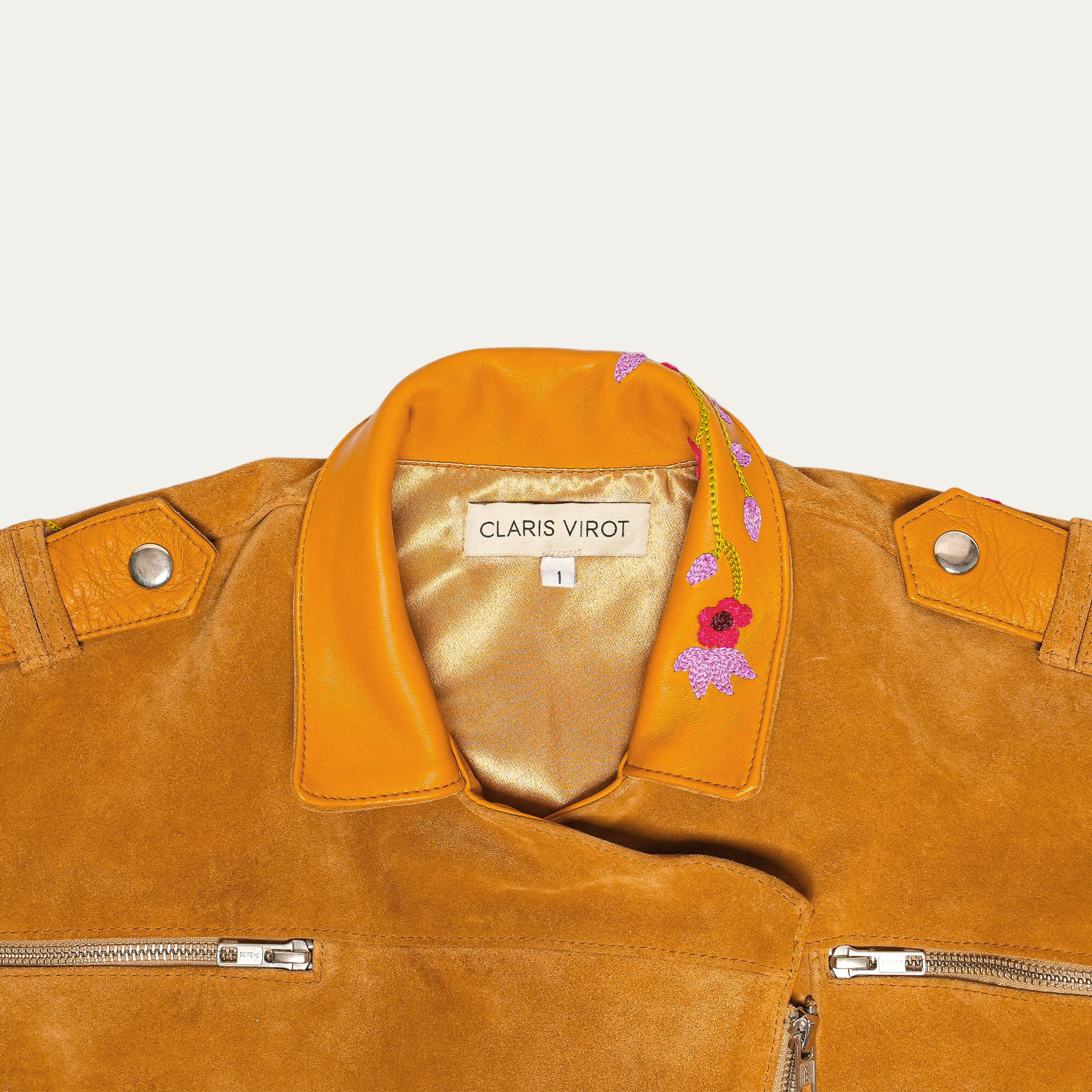 Ensemble, nous avons imaginé des pièces uniques et complémentaires : un premier look composé d'un pantalon et d'une veste en cuir - une première pour SANJE - associé à des accessoires façonnés à la main dans les ateliers de CLARIS VIROT.